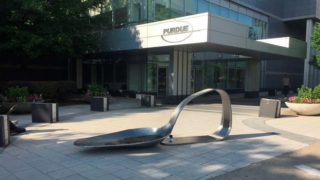 STAMFORD, Conn. – An 800-pound, nearly 11-foot-long steel sculpture of a bent and burned drug spoon was placed Friday in front of the Connecticut headquarters of drugmaker Purdue Pharma as part of an art protest against the opioid crisis.