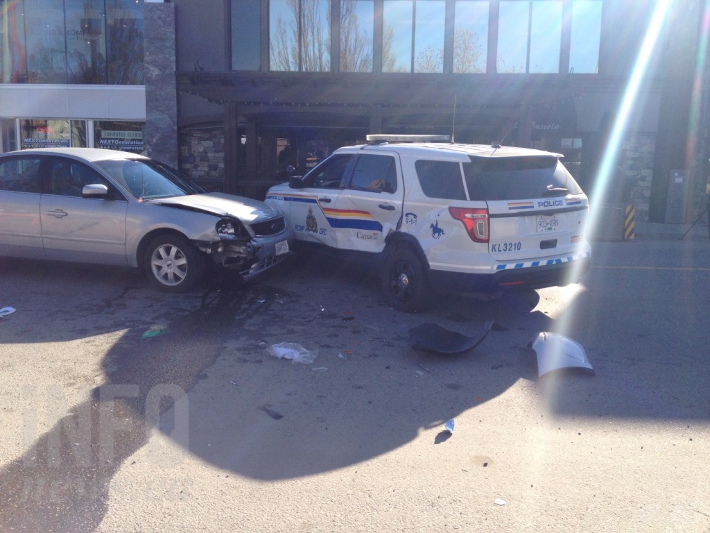 An officer in a marked RCMP SUV was broadsided by a suspect vehicle on Ellis Street near the Queensway bus loop on April 1. The suspect jumped out, ran to the police vehicle and assaulted the officer inside.