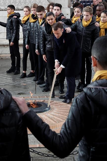 At a Paris ceremony Sunday marking the centennial of the armistice ending the first global war, eight teenagers born in the 21st century read from letters and notes written on the day the bloodshed stopped, Nov. 11, 1918. They then helped French President Emmanuel Macron rekindle the flame at the Tomb of the Unknown Soldier.