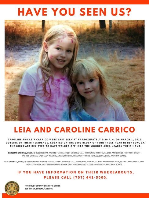 Eight-year-old Leia Carrico and 5-year-old Caroline Carrico were last seen around 2:30 p.m. outside their home in Benbow, a small community about 200 miles (320 kilometres) northwest of Sacramento.