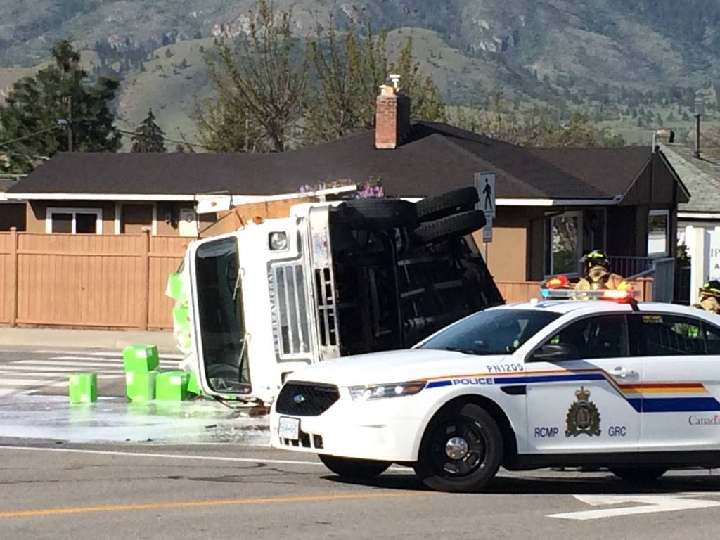 PENTICTON – Wine is flowing down the street following a collision between a delivery truck and a car is tying up traffic this morning in Penticton.