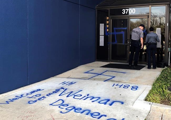 Racist and anti-Semitic graffiti as well as anti-LGBTQ epithets were spray painted on the front door, walkway and other areas outside the state Democratic Party headquarters in Oklahoma City, said former Democratic Gov. David Walters, who owns the building with his wife, Rhonda. Swastikas were also spray-painted onto the doors.
