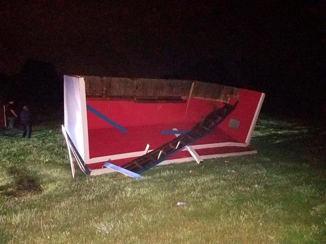 Tuesday’s tornado damaged Lenape Valley Regional High School’s facade and ripped up a softball dugout, depositing the roof on its side on the ground. Toppled trees and power lines left most residents without electricity.