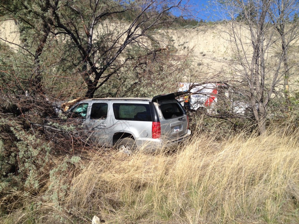 RCMP say the collision between a commercial panel van and a GMC Yukon, which were both northbound on Highway 97, sent the Yukon off the road and into some trees along the shoreline of Okanagan Lake.