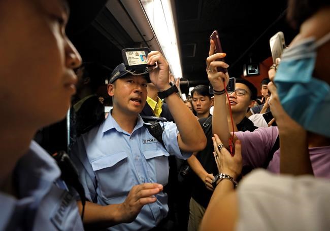 Associated Press video showed heated exchanges at Tiu Keng Leng station, where a crowd of protesters and commuters filled the platform and a stopped train.