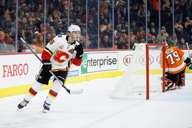 Mangiapane tied it at 1 1:01 into the third period, stopping the Flames’ long scoreless road drought. After a turnover by Flyers rookie Morgan Frost in his third career game, Mangiapane’s wrist shot went off defenceman Philippe Myers and past Hart.