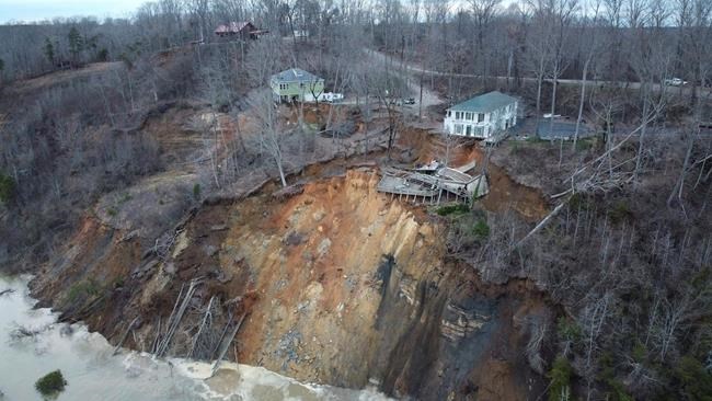 Dramatic video posted by a Tennessee fire department showed the impact near Savannah: Two houses tumbled down a bluff over the Tennessee River, while many others have been swamped to their rooftops, as entire neighbourhoods disappear in muddy water below the Tennessee Valley Authority’s Pickwick Reservoir.