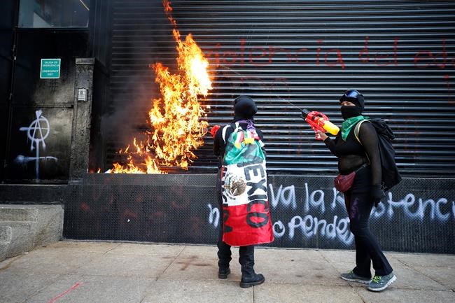 Some spray painted messages like “Mexico kills women” onto monuments, smashed windows and set fires — often to cheers from the multitude. Most marched peacefully in groups organized by universities, non-profits or with friends.