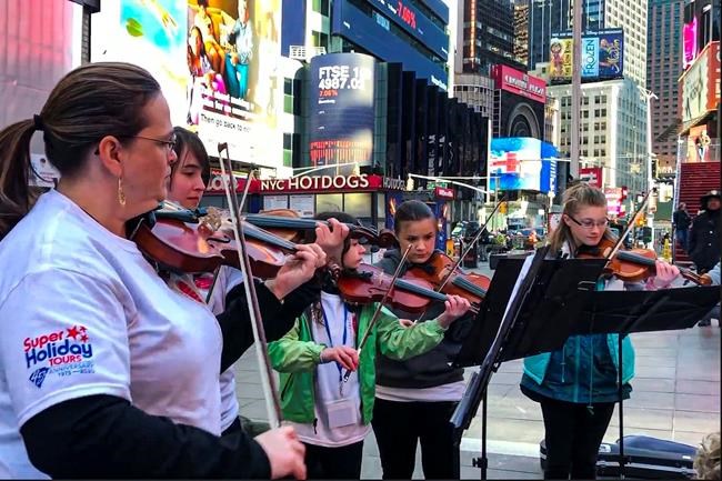The young musicians from the Alliance Charter Academy in Oregon City, Oregon, got word their planned Carnegie Hall performance had been cancelled just before they were scheduled to leave. Some of them decided to come anyway, and took their stringed instruments to Times Square, playing for the few hardy souls still out and about.