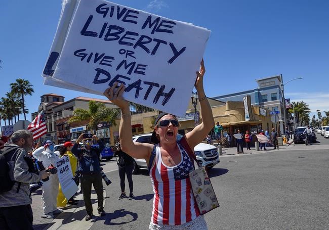 THE FACTS: Social media users are sharing an altered photo of a woman holding a sign at a protest against California stay-at-home orders earlier this month. The actual sign said: “Give me liberty or give me death,” a famous quote from Patrick Henry’s speech at the Virginia convention in 1775. The images are identical except for the sign carried by the woman, who is wearing an American flag tank top, hat and sunglasses. In the manipulated photo the woman’s sign spells out the full name of former President Barack Obama, placing a tally of the number of letters contained in each part of his name. An online conspiracy theory movement called QAnon often uses numbers associated with significant dates or the numbers of letters corresponding to a person’s name to promote baseless claims of an attempted coup against President Donald Trump’s presidency. In this case, social media users falsely claimed the woman was some linking the letters in Obama’s name to COVID-19, although the number of letters in his name only equals 18. Social media users posted the doctored image with comments mocking the woman for the math error. The original photo was taken during a protest in Huntington Beach, California, by Jeff Gritchen, a staff photographer for the Orange County Register. In an email, Gritchen confirmed the image had been edited and said he had seen the altered photo “getting a lot of traction online.”