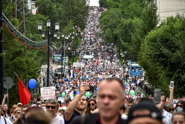 KHABAROVSK, Russia – Tens of thousands of people marched Saturday across the Russian city of Khabarovsk on the border with China to protest the arrest of the regional governor on murder charges, continuing a wave of protests that has lasted for two weeks in a challenge to the Kremlin.