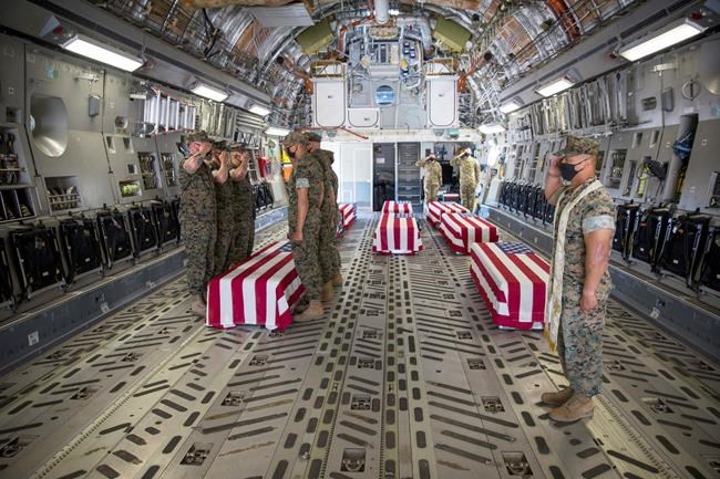 The Marine Corps said Tuesday that six pallbearers of Marines and sailors escorted each casket aboard a U.S. Air Force C-17 Globemaster III at Marine Corps Air Station Miramar in San Diego. The body of another Marine was transferred Aug. 5.