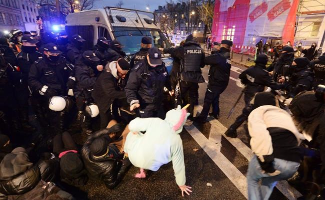 WARSAW, Poland – Police detained several people and charged a female photojournalist with assaulting a police officer as women-led protests over abortion rights flared up again on Monday in Poland.