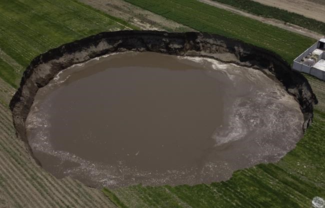 MEXICO CITY (AP) — A large sinkhole that appeared in late May at a farm in central Mexico has grown larger than a football field, begun swallowing a house and trapped two dogs in its depths.