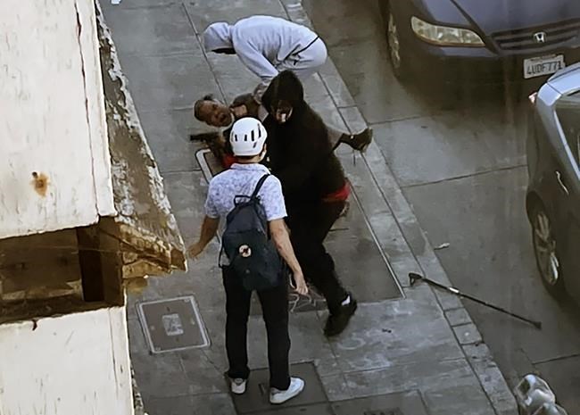 Surveillance video tweeted by a KPIX-TV reporter shows the victim on the ground, his walking cane nearby, and a robber trying to take his watch. The armed man is seen striking a bystander wearing a bike helmet on the head with his gun as the man tried to intervene, causing him to fall.