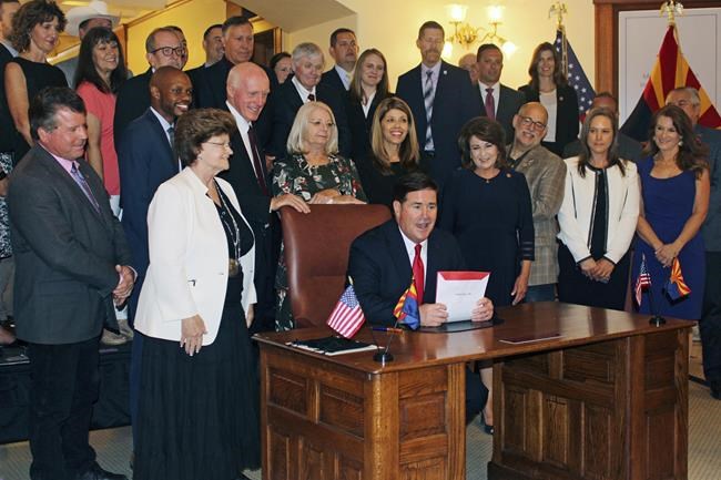 “These challenges made it necessary for us to act,” the Republican governor said at a signing ceremony in the historic Capitol rotunda. “So today we are taking action to do what the men and women of Arizona hired us to do — position our state for success today, tomorrow and for generations to come.”