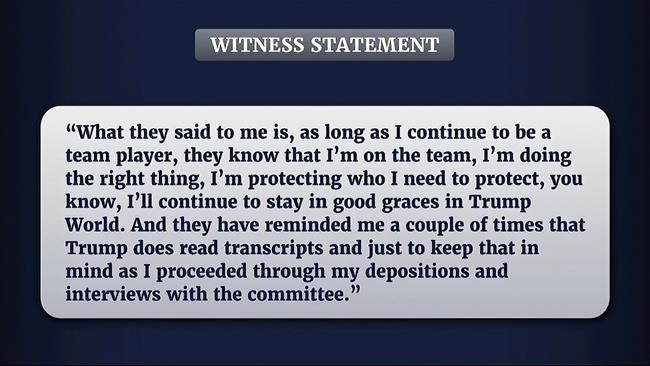 Instances cited by the Jan. 6 committee would appear to involve nuance. In one, a witness said they were told that “as long as I continue to be a team player, they know I’m on the right team. I’m doing the right thing. I’m protecting who I need to protect, you know, I’ll continue to stay in good graces in Trump World.”