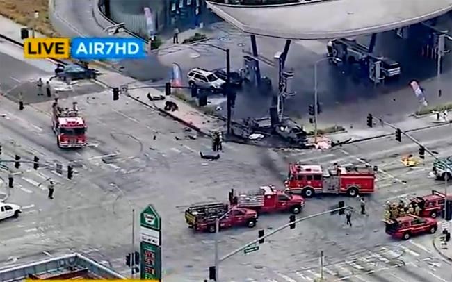 Shortly after 1:30 p.m. Thursday, a Mercedes-Benz sedan ran a red light at high speed and caused the crash involving as many as six cars near a gas station in the unincorporated Windsor Hills about 10 miles (16 kilometers) southwest of downtown LA, according to the California Highway Patrol.