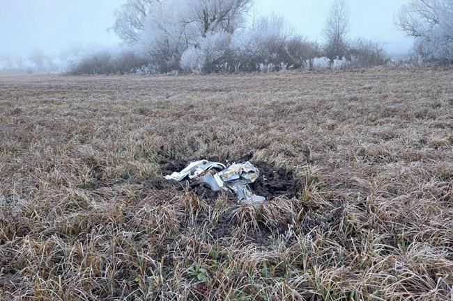 Photographs posted on the ministry’s Facebook page Sunday show what appears to be a large cylindrical object loaded with white powder. The ministry has not said when the rocket was fired or who fired it but said it originated “from Russia’s air attacks on Ukraine” and that Ukrainian authorities were informed.