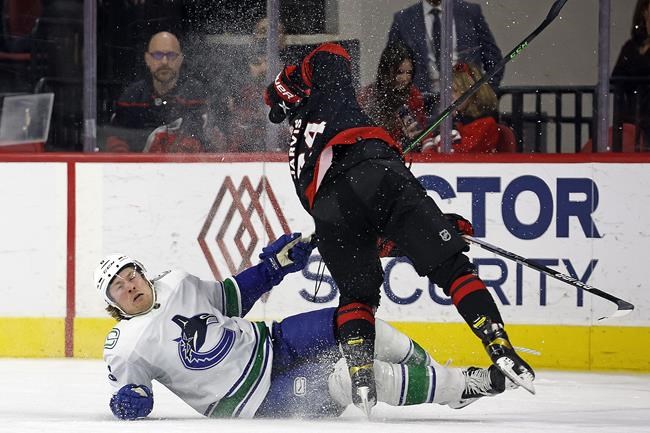 The Canucks allowed at least four goals in the first four games of the road trip. … Vancouver improved to 2-7-1 against Metropolitan Division opponents. … Carolina has played in a league-high 15 games that have extended beyond regulation. The Hurricanes are 7-8 in those, including 3-2 in shootouts.