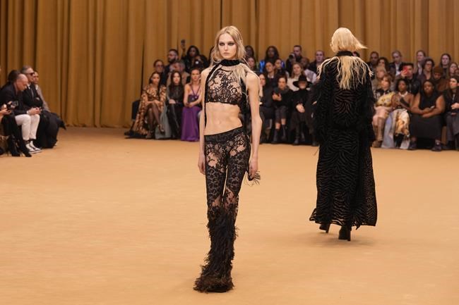 The looks veered into pure punk with jackets and skirts covered with spikes and accented with mesh, and then adorned with bejeweled broaches for an aristo-punk vibe, that culminated with a tulle princess dress worn with bejeweled opera gloves. There was a Mardi Gras moment with bejeweled bra top and sequined and beaded dress. Shoes featured zig-zag heels.