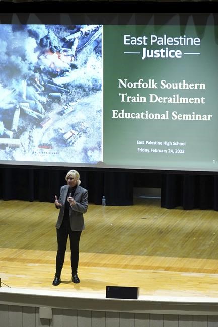 EAST PALESTINE, Ohio (AP) — Worried residents packed a high school auditorium Friday as activist Erin Brockovich and attorneys warned of long-term health and environmental dangers from chemicals released after a fiery train derailment in East Palestine, Ohio.