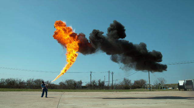 Gav and Dan, The Slow Mo Guys, demonstrate the power of a 50 foot flamethrower.