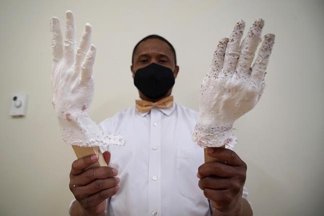 Retiree Ervin McDaniel Jr. was giddy as he held up his freshly made plastic hands, which will be cast in bronze to represent the boy born into slavery who was given the name Fumu.