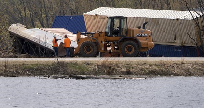 Two cars went into the Mississippi River, but neither contained hazardous materials, Kent said. Some of the containers that derailed on shore contained paint and lithium-ion batteries, and a boom was being placed in the impacted area, she said.
