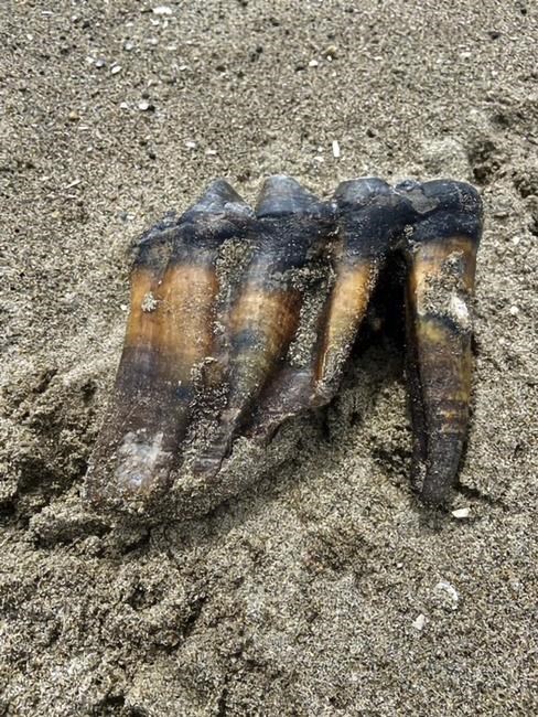 APTOS, Calif. (AP) — A woman taking a Memorial Day weekend stroll on a California beach found something unusual sticking out of the sand: a tooth from an ancient mastodon.