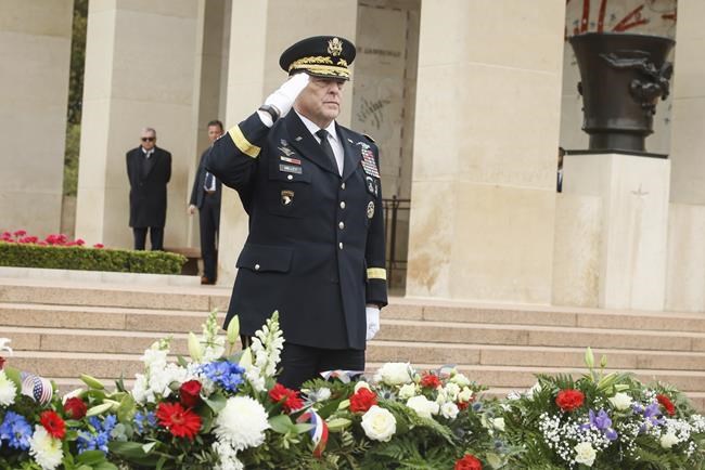 Standing in front of rows of white crosses at the cemetery, Milley spoke just a few minutes after he and other top U.S. and allied military leaders laid wreaths and saluted the gathering of the last surviving World War II veterans attending the ceremony. The veterans, some of whom had stormed Omaha Beach, were almost all in their late 90s. But as Taps played, many rose from their wheelchairs to stand for the tribute.