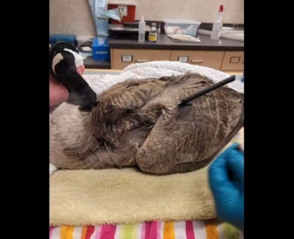 “Upon admittance, our rehabilitation team put the goose under anesthesia and assessed the position of the arrow in its wing,” the post reads. “With no fractures or bone involvement, they were able to pull the arrow out of the three layers of impacted tissue (shoulder, wing, and forearm area). The wound sites were flushed and due to the contamination to the wound site it was allowed to heal on its own, with no stitching.”