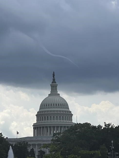 WASHINGTON (AP) — Observant visitors to the area around the U.S. Capitol building on Tuesday afternoon were treated to a unusual sight: the unmistakable shape of a funnel cloud extending diagonally from the sky and seemingly almost reaching the tip of the Capitol dome itself.