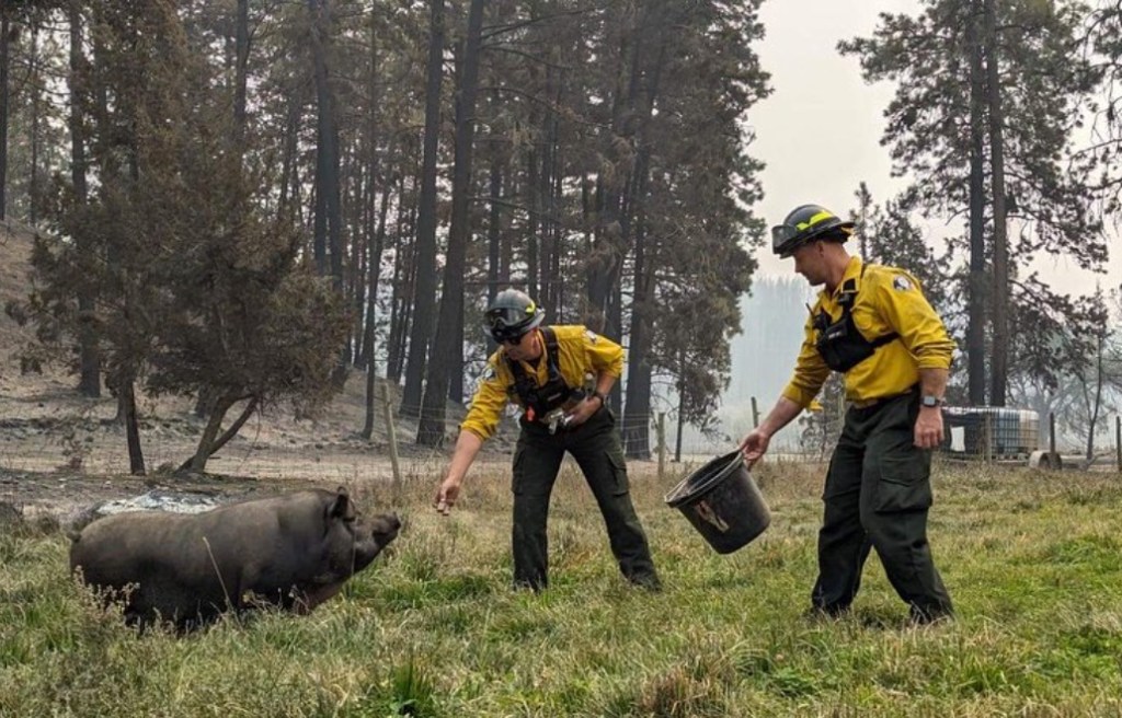 On Sunday, Aug. 19, the couple received images from firefighters showing Poomba standing on a singular patch of unburnt land, being fed granola bars by firemen.