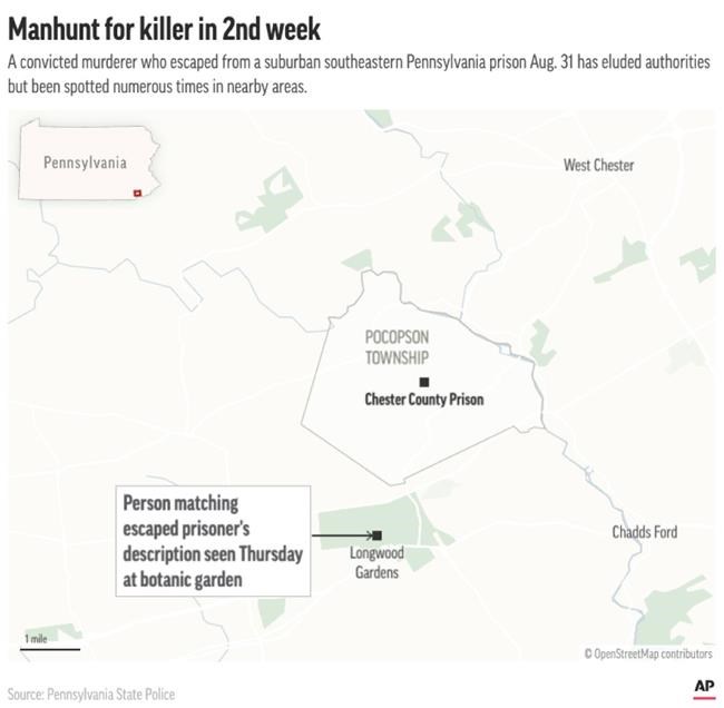WEST CHESTER, Pa. (AP) — An escaped murderer on the run in southeast Pennsylvania has so far eluded hundreds of law officers — including tactical teams in full combat gear, tracking dogs, cops on horseback and aircraft — as the search entered its second week Thursday and nervous residents stayed alert for any sign of the fugitive.