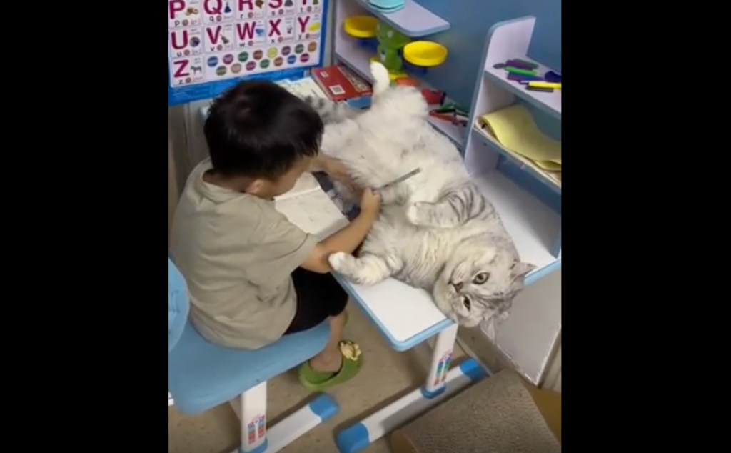 This studious little guy just wants to finish his homework assignment but his huge cat has other ideas.
