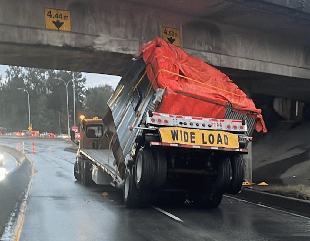 VANCOUVER – A transport truck hauling a large, square container slammed into an overpass in North Vancouver on Tuesday, snarling traffic on Highway 1 for hours, and B.C.'s latest case of overheight mayhem also has a bizarre twist.
