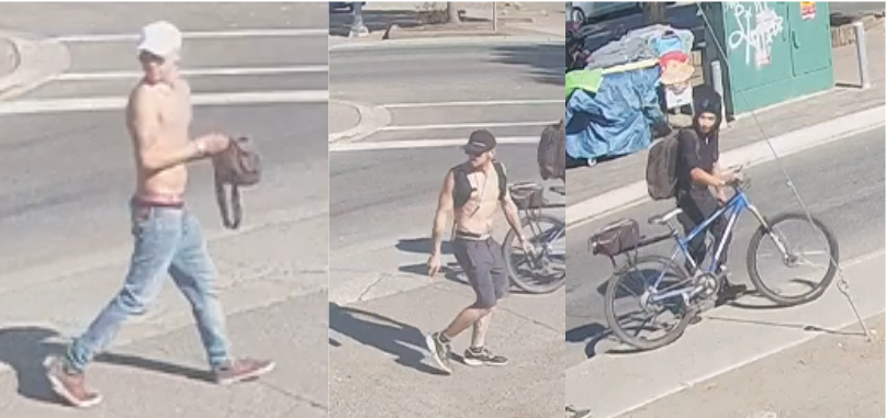 The first male is described as shirtless, wearing a white baseball hat, sunglasses, blue jeans, and brown shoes and carrying what appeared to be a brown bag with a long strap. The second is shirtless and muscular, wearing grey or black knee-length shorts, a black baseball hat, sunglasses, black and white running shoes, and a black backpack. The third was associated with a blue and silver bicycle, and was wearing a black hoody, pants, shoes and had a backpack.