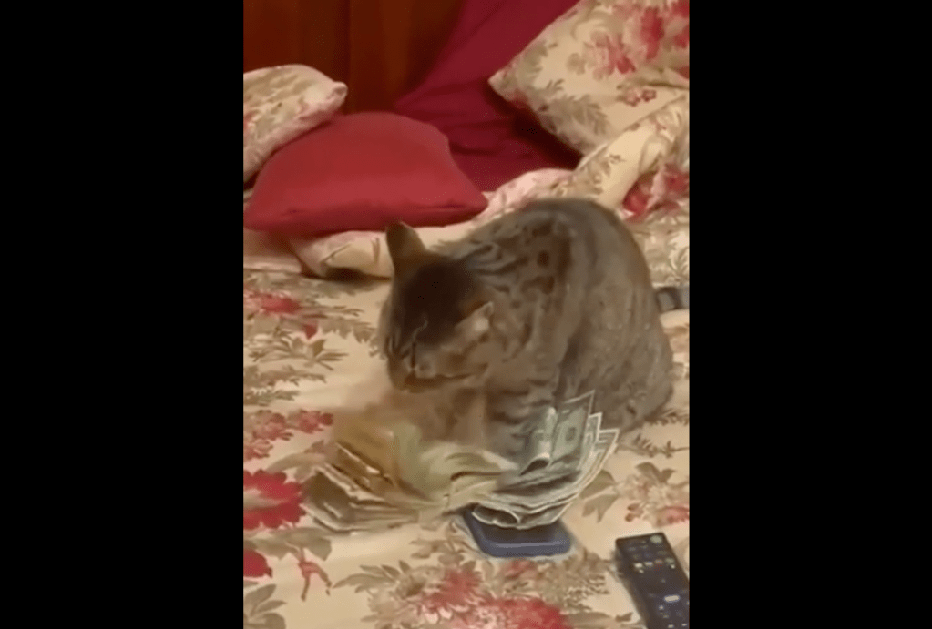This cat is tallying up the petty cash for the week.