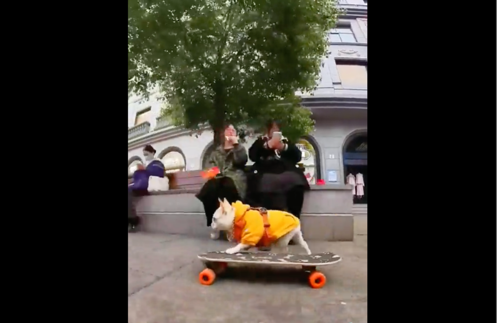 This dog is cruising through the streets, seems like it's ready to go pro.