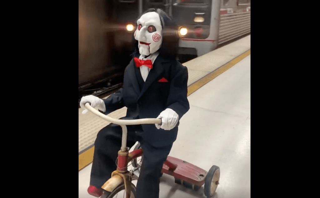 Billy the Puppet from the Saw movie franchise made a 'terrifying' appearance on the subway in Los Angeles.