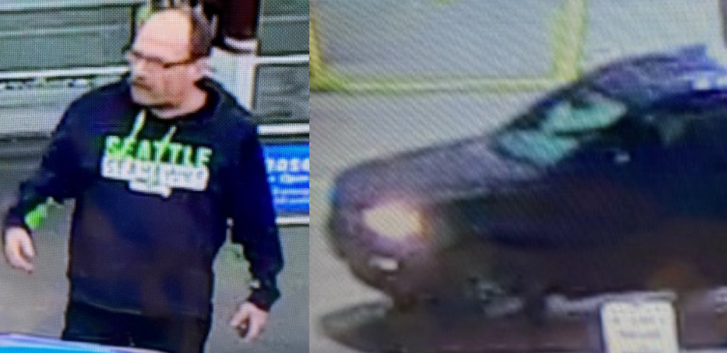 RCMP describe the suspect as a Caucasian man with balding dark hair, a moustache and glasses. He was wearing a blue and green Seattle Seahawks sweater.