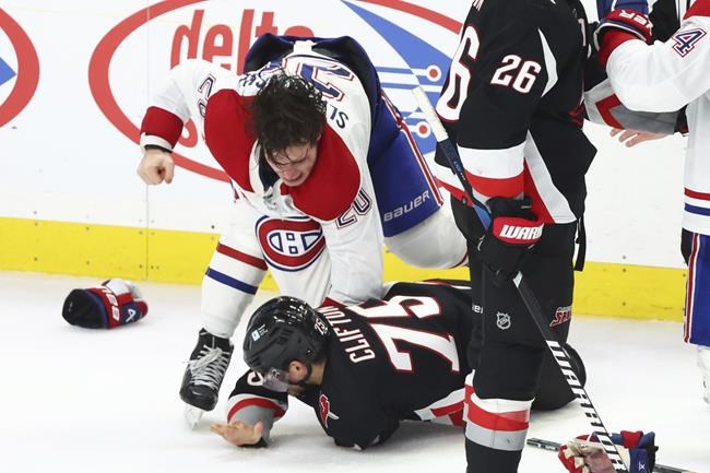 Buffalo’s Eric Robinson received a five-minute major for boarding and a game misconduct and Montreal’s Kaiden Guhle went off on a roughing minor 11 minutes into the second period. Struble deflected a shot from Johnathan Kovacevic past Levi at 12:59 during the 4-on-4 for his first NHL goal. Struble and Levi were teammates at Northeastern University last season.