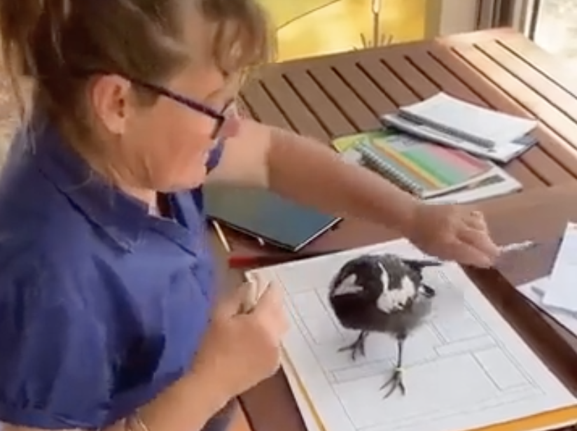 Lady with a pet Magpie gives belly rubs