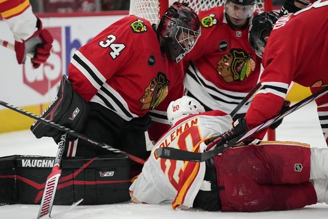 CHICAGO (AP) — Colin Blackwell had two goals and an assist and the Chicago Blackhawks won their first game since Connor Bedard was sidelined by a broken jaw, topping the Calgary Flames 4-3 on Sunday.
