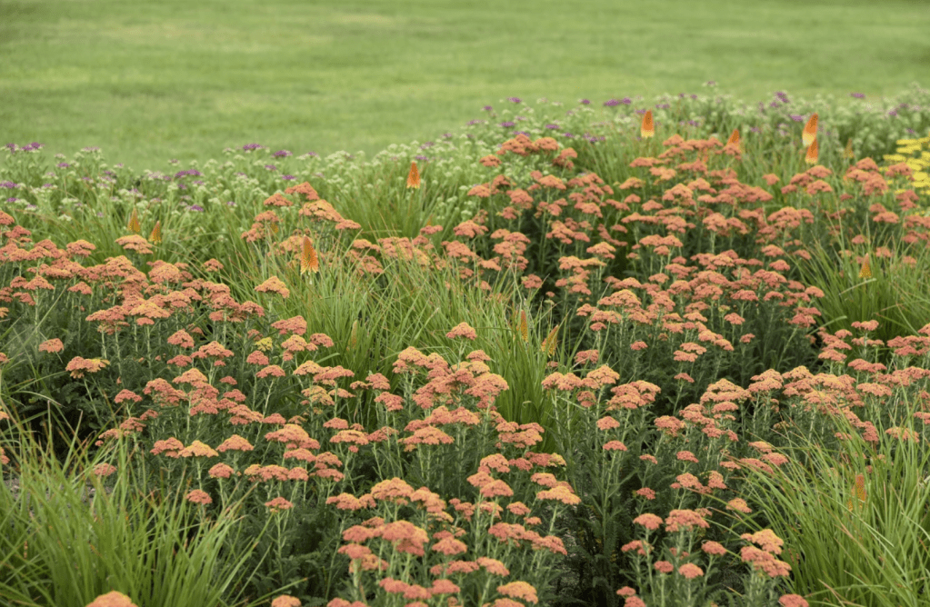 Firefly Peach Sky yarrow flowers emerge peachy and then fade to yellow as they age, creating a kaleidoscope of peach, orange, cream and yellow interest as some flowers in different stages of maturity converge. Thrives in zones 3-8.