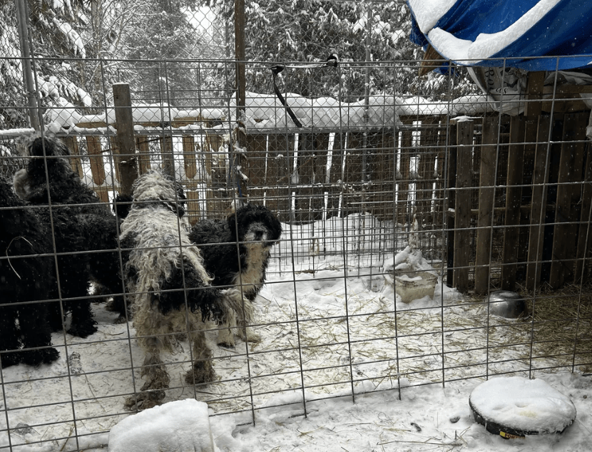 The pens the dogs were found in were contaminated with feces and urine, and dirty water bowls were flipped over or frozen.