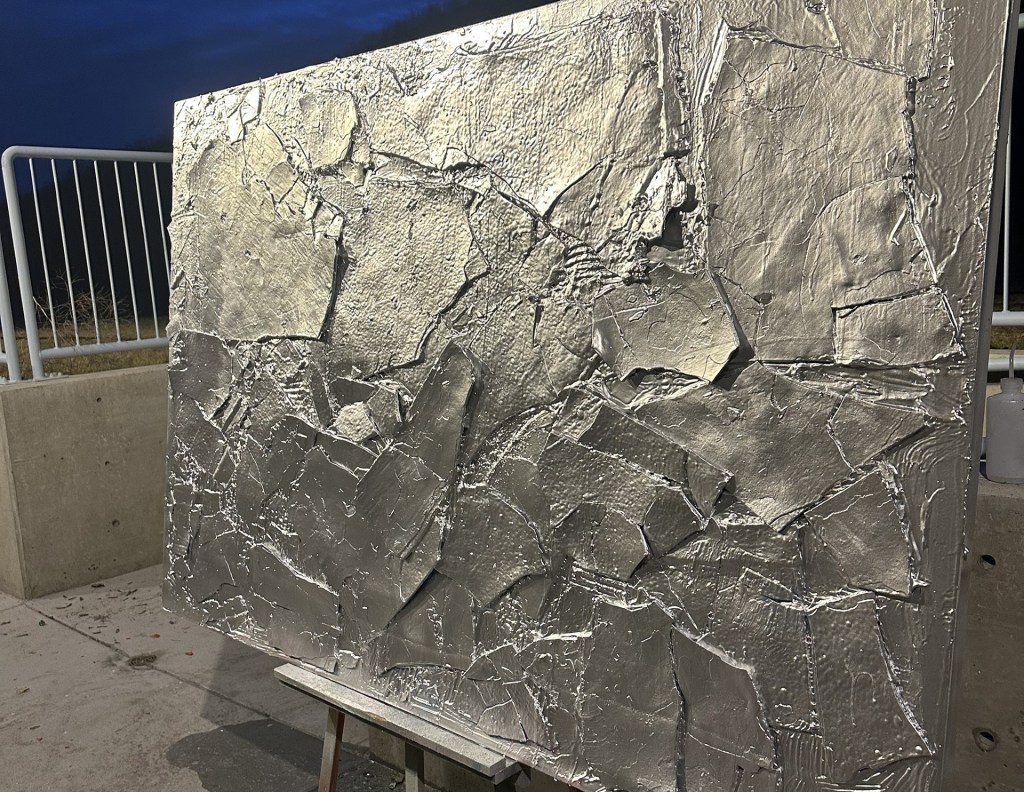 The painting is a 40 by 60 inch canvas and weighs around 100 pounds. It is painted chrome with neon paint that had just been added to it.