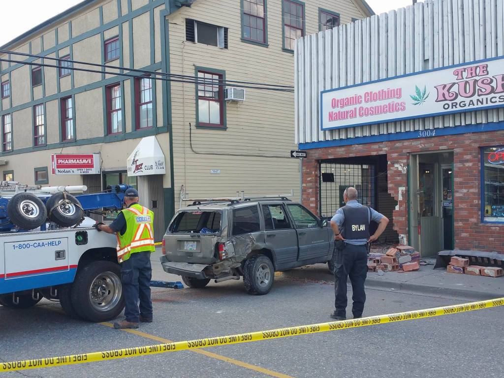 The bizarre incident happened downtown on 30 Avenue today, Aug. 5 and involved a 1996 Jeep Cherokee SUV crashing through the front of a store.