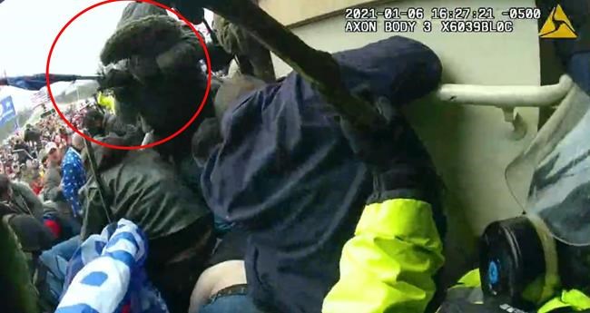 Approaching the mouth of a tunnel on the Capitol’s Lower West Terrace, Foy picked up a sharpened metal pole and hurled it like a spear into the body of a police officer, who fell over.